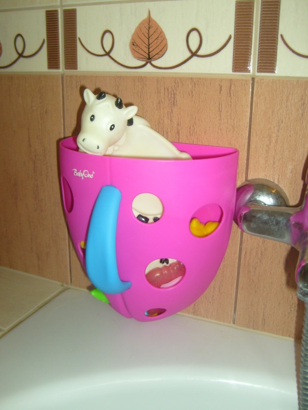 Wszelkie zabaweczki kąpielowe - kaczuszki, krówki i inny zwierzyniec ma od wczoraj swoje miejsce - piękny różowy, duży i poręczny pojemnik na gadżety kąpielowe:) Zabawki pięknie ociekają i są gotowe na zabawę na następny wieczór