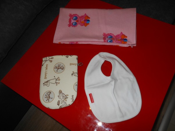 Myjka może nie przyda się od samego początku, ale później będzie jak znalazł :). Natomiast pieluszka w różowe sówki jest słodziaśna, śliniaczek z bardzo dobrego gatunku bawełny, taki malutki...