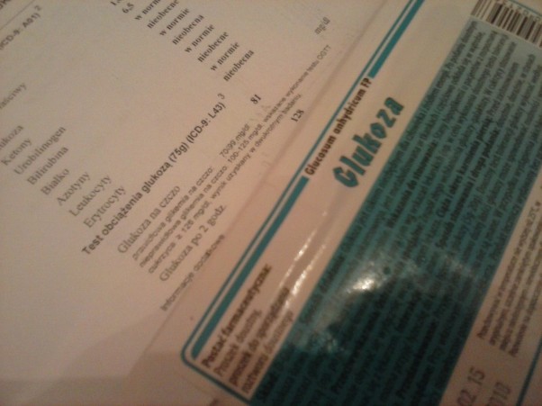 Tego dnia, wygłodzona po nocy udałam się do laboratorium w klinice na badania krwi i nieszczęsny test obciążenia glukozą, no ale czego się nie robi dla zdrowia maluszka :) Badanie na czczo przeszło szybko za pomocą glukometru a później dostałam kubeczek z cudownym napojem po którym masz ochotę tylko zwymiotować no ale miałam aż 5 minut na wypicie więc spokojnie powolutku wypiłam bez zbędnych sensacji. W ciągu tych 2 h parę razy mdliło ale malutki łyczek wody i problem mijał, za to nuda przez te czekanie bardziej dobijała ale gdy przyszedł koniec, przyszła ulga, szybkie pobranie krwi i do domku :) Żałuję tylko że nie wzięłam nic do jedzenia bo nim dotarłam do domu, prawie zemdlałam na ulicy ale na szczęście chwiejnym krokiem doszłam i szybko zanurkowałam w lodówce :) Ależ to była ulga gdy wciągnęłam 3 kanapki w siebie :P, dlatego dziewczyny bierzcie coś do zjedzenia po takim badaniu bo różnie może być :)
