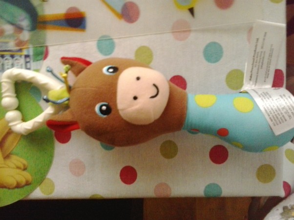 Synuś w drodze, a my juz mamy pierwsza nową grzechotke. Niebieska żyrafka z kuleczkami w środku z możliwością zawieszenia np. na łóżeczku lub wózeczku. Jest sliczna.Wojtuś to dla Ciebie!