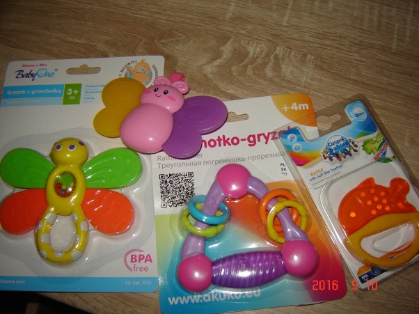 Coś dla umilenia czasu i wychodzących ząbków.Fajne rozwiązanie kiedy gryzak służy równiez jako grzechotka.Kolorów i wzorów całe mnóstwo w sklepach.To nasze pierwsze