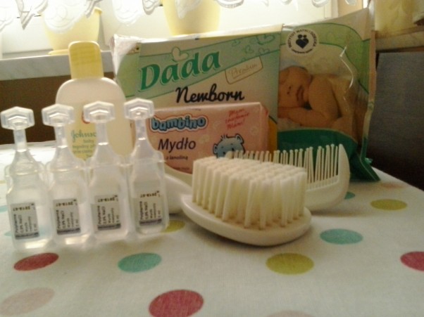 Wojtuś mam nadzieję, ze nie przeraża Cię jeśli mama użyje tych wszystkich kosmetyków na Twojej skórce!A tak naprawdę, to oczywiście nie będą przesadźać, używamy tylko to co niezbędbe, i w odpowiedniej ilości!Sól fizjologiczna do oczek + waciki, wypróbuję nowe chusteczki Dady, Płyn do mycia z Johnnsona,ale tylko w razie niepowodzenia z Linomagiem, Mydełko bambino, jeśli dwa poprzednie kosmetyki się nie sprawdzą, oraz Szczoteczka i rzebyk Tommy Tippe po starszym synku!