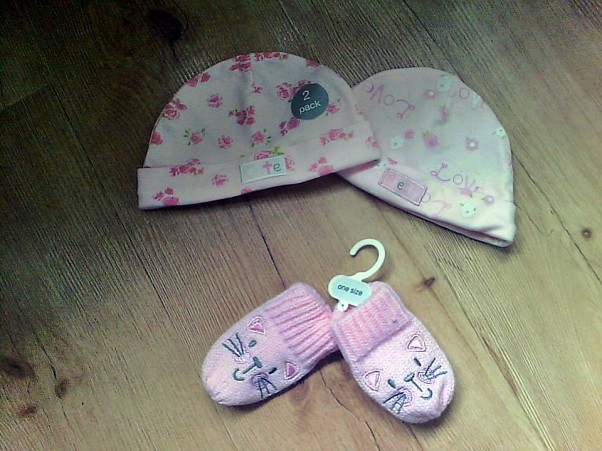 Moje dzisiejsze łupy za 2 zł. Szkoda, że tatuś nie rozumie, że skoro to są nowe rzeczy za tak śmieszne pieniądze to grzech nie wziąć mimo że różowe :) Pomarudzi i przestanie a Liliance będzie ciepło w główkę po kąpieli i w rączki zimą :) Chyba mąż za bardzo przywykł do innych kolorów przez te 6 lat :)