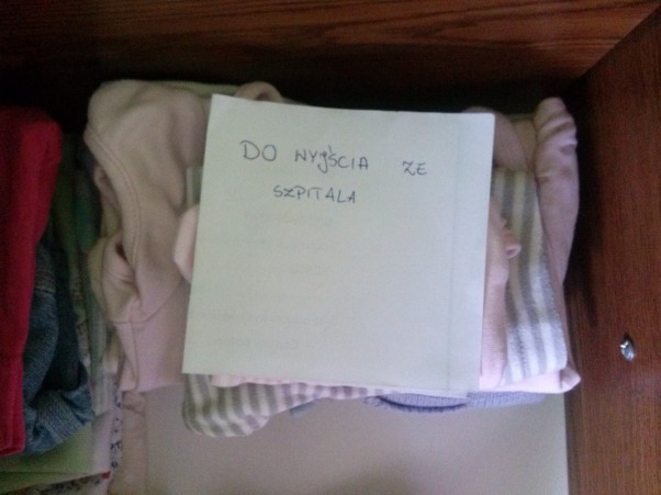 Powszechnie wiadomo że mężczyźni to niezbyt sprytne istoty Boże ;P chcąc uniknąć problematycznych pytań i długich tłumaczeń telefonicznych gdzie co leży jak wygląda i co ma zabrać, przygotowałam dla Tatusia gotowy zestaw ubrań do wyjścia ze szpitala dla Lenki- oczywiście zostawiając karteczkę na nich żeby było jeszcze łatwiej znaleźć:P