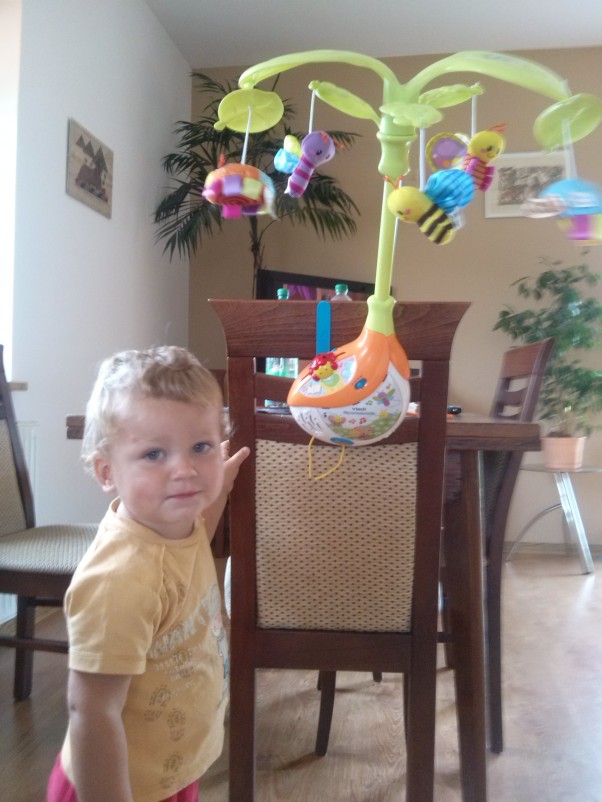 Długo mamusia oglądała i wybierała spośród przeróżnych modeli i firm karuzelki do twojego łóżeczka córeczko. W końcu po długich namysłach i trudach udało się wylicytować tą najśliczniejszą dla Ciebie:) ma 40 melodii i dużo odgłosów natury, a kolorowe zwierzątka będą powoli kręciły się nad twoją główką umilając ci czas i rozwijając Twój wzrok i słuch :) twój braciszek testował już czy wszystkie guziczki działają i czy kręcące się motylki, pszczółki i inne owady są mocno przyczepione żeby ci na buzie nie spadły ;)