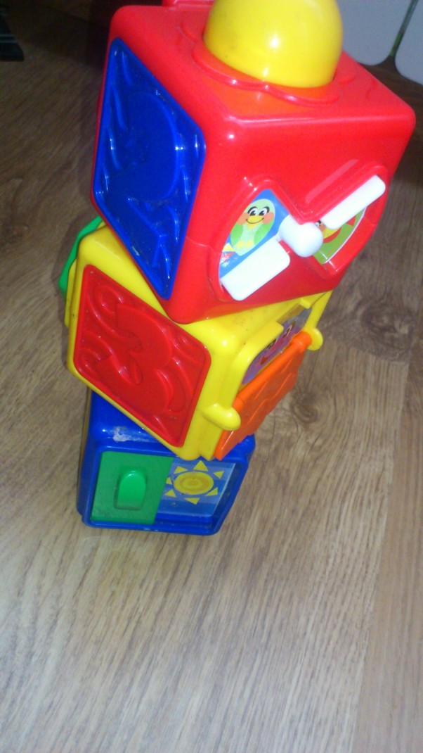 Można je złożyć i postawić wieżę, poza tym tu się coś otwiera, tam wciska, tu grzechocze... jednym słowem dużo do odkrycia dla małych rączek.