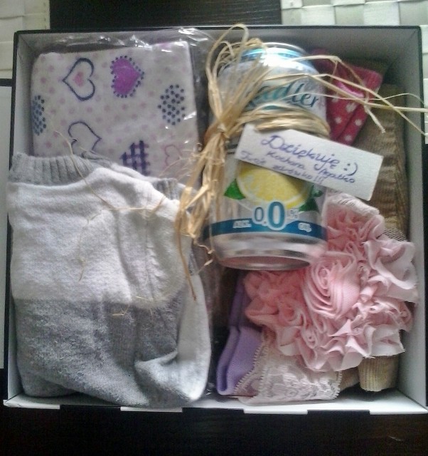 No rozpieszcza nas cioteczka strasznie :-) Nie spodziewałam się takiego pięknego prezentu a tu po rozpakowaniu paczuszki szok!!!! Takie piękne rzeczy- moja ulubiona pieluszka, sweterek, sukienusia, opaski, skarpetki. Nawet moje bezalkoholowe ulubione piwko- lemoniadka się w niej znalazło :) Nasze zdrówko kochana :) I naszych bobasków :-)