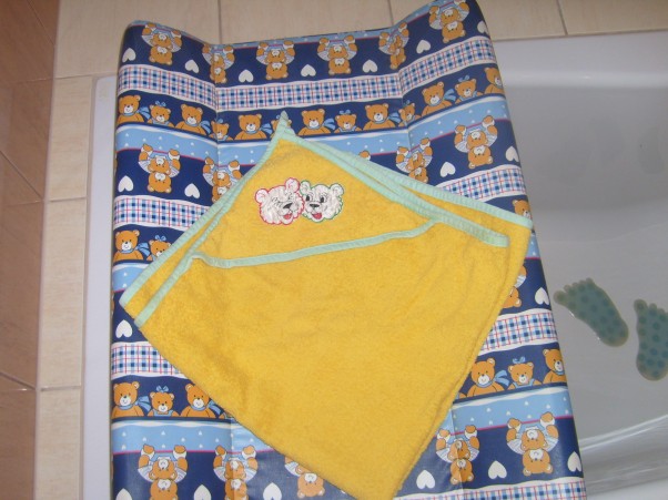 I kolejna przydatna rzecz: piękny przewijaczek z misiaczkami i ręczniczek z kapturkiem czekają zainstalowane w łazience:) - piękny prezent od sąsiadki. Do pełni wyposażenia brakuje nam wanienki - ale na nią bardzo liczymy w konkursie:)