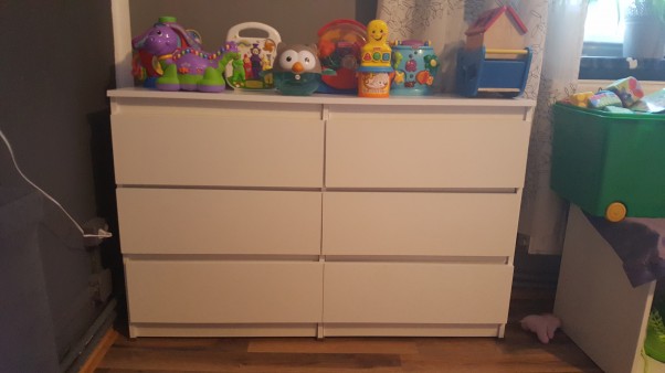 Stoi złożona z poustawianymi już na niej zabawkami starszej przyszłej siostry która bardzo nie może doczekać się na młodsze rodzeństwo...na razie zajęła nie tylko wierzch komody ale także jej cześć szuflad na swoje zabawkowe skarby...