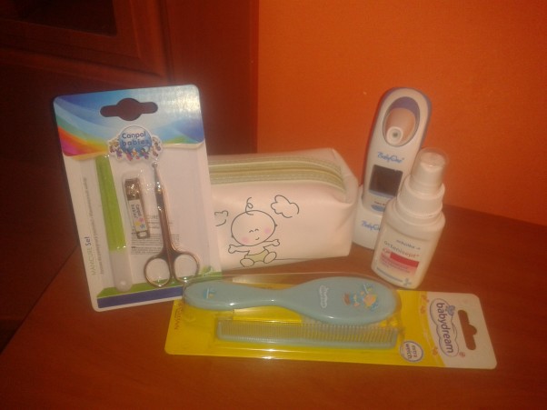 Dzisiaj zakupiliśmy pierwsze niezbędne kosmetyczne rzeczy naszemu syneczkowi tj. szczoteczka i grzebyczek oraz przybory do pielęgnacji dłoni tych maleńkich oraz coś do pielęgnacji pępuszka i termometr, wybraliśmy elektroniczny do czoła i ucha :)Szwagierka, zakazała mi kupować kosmetyki gdyż stwierdziła że w Holandii są dużo tańsze i ona kupi mojemu synkowi w prezencie no cóż nie będę protestować :) A taki prezent byłby trafiony i troszku odciążył by moją kieszeń :)