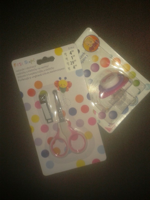 Teraz czas na kosmetykę dla maluszka , smoczek , nożyczki i obcinaczki już mamy :) Wszystko bezpieczne z zaokrągloną końcówką.