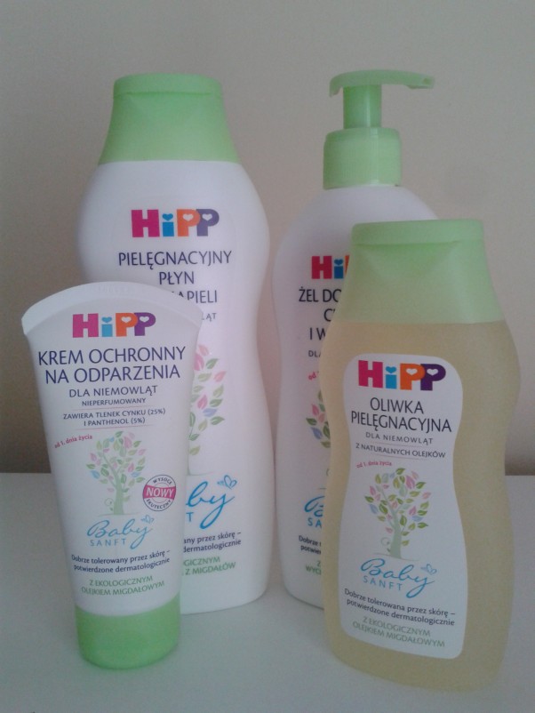 W końcu zdecydowałam jaką linię kosmetyków wybrać dla Oli - wybór padł na produkty firmy Hipp. Wybrałam je ponieważ mogą być stosowane od 1 dnia życia, zawierają wyciąg z ekologicznych migdałów, jest dobrze tolerowany przez wrażliwą skórę skłonną do atopii. Oczywiście nie zawiera parabenów, olejków eterycznych czy substancji uwazanych za alergizujące. Używałam tych kosmetyków także przy Marcelku i bardzo mi odpowiadały. Mam nadzieję, że tym razem również się sprawdzą.