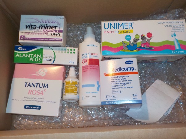 Przyszła paczka z apteki ;-) już nie mogłam się doczekać ;) W końcu potrzebuję już skończyć pakowanie toreb a jeszcze brakowało paru drobiazgów. Teraz już mamy czym czyścić nosek Hani, czym pielęgnować pępuszek, czym smarować pupcię i resztę ciałka. Aaa i mama ma swoje witaminki. Przygotowania już spokojniejsze ale dalej w toku ;-) Jeszcze tylko 22 dni ;-)