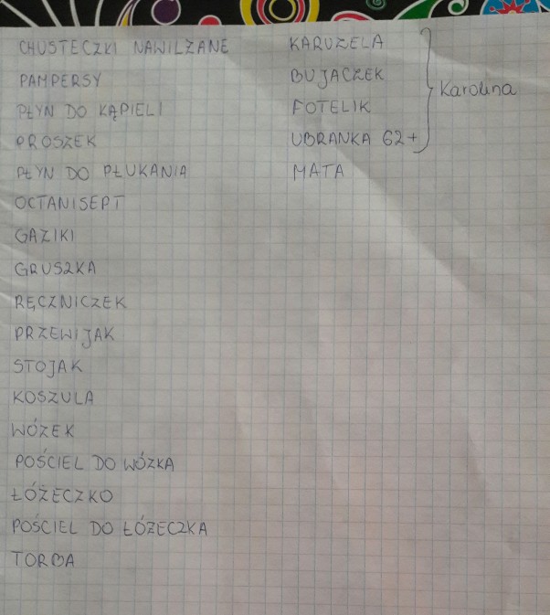 Zrobiłam listę co mi jeszcze zostało do kupienia a co dostanę od szwagierki. Sporo rzeczy już mam, ale problem mam z ciuszkami bo część mam w Niemczech a część w Polsce. Za tydzień zabiorę wszystko do Pl i spisze listę ubranek, zobaczę ile jeszcze mi ich brakuje. Na pewno skarpetek nie mam :p