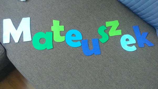 na poczatek zrobilam kolorowy pojedynczy napis z imieniem, jeszcze tylko pozostalo mi zszyc wszystko razem i powiesic :)