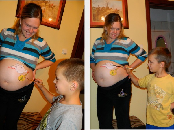 Starszaki I z pomocą cioci) postanowili namalować boćka na brzuszku. Zabawy było wiele. A potem robiliśmy fotki z pomalowanym brzuszkiem. Polecam wszystkim przyszłym mamom, które mają już starsze dzieci - to naprawdę fajna zabawa :)