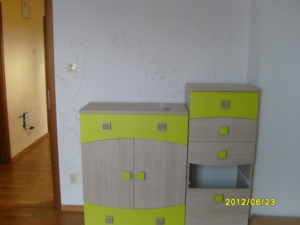 powoli, powoli meblujemy pokoik. Niedawno wprowadziliśmy się do nowego domku. Szafka i szufladki prawie gotowe. Mąż zakrył ścianę z moimi malunkami, które tak lubiła moja starsza córcia:)