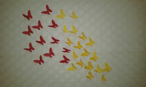 znalazłam gdzieś w Internecie i strasznie mi się spodobały a że ruszył remont pokoiku chciałam zobaczyć czy mi się uda . Siedziałam i wycinałam te motylki aż mi się odcisk bolący zrobił od nożyczek ale kiedy przykleiłam parę sztuk wiedziałam że będzie ładnie :) kiedy przechodzi się koło ściany delikatnie ruszają skrzydłami co daje super efekt...