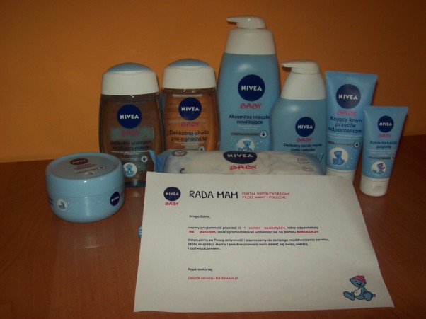 Zdobyłam ponad 150 punktów. Na razie otrzymałam kosmetyki Nivea za uzbierane 100 punktów oraz przemiły list od "Rady mam". Bardzo dziękuję.