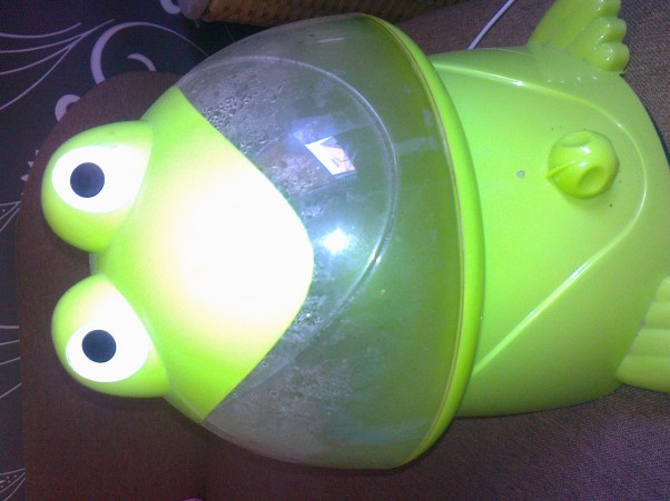 Jak zaczęłam go rozpakowywać to myślałam że to jakaś zabawka dla Ciebie Skarbie, albo lampka nocna , no bo otwieram karton a tam zielona żaba siedzi dopiero po całkowitym rozpakowaniu domyśliłam się ze to nawilżacz powietrza.
