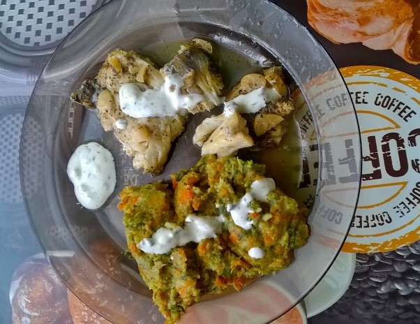 Ryba na parze, obłożona czosnkiem, podana z pire z brokułów i marchewki, polana lekkim sosem czosnkowym. Brzmi ciekawie? Smakuje jeszcze lepiej i co najważniejsze jest zdrowe!