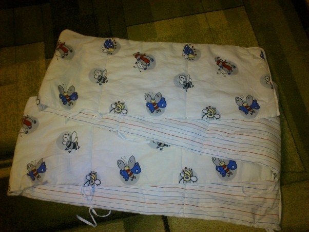 Jakiś czas temu upolowałam w bardzo atrakcyjnej cenie taki oto ochraniacz na szczebelki łóżeczka. Będzie dobrze chronił główkę dzidziulka jak zacznie fikać w łóżeczku!:-)