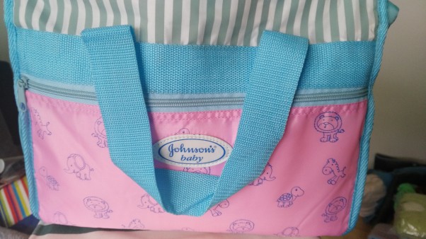 Na warsztatach Mamo to ja mój dzielny mąż na ochotnika kąpał dzidziusia za co został nagrodzony taka oto torba z kosmetykami dla maluszka