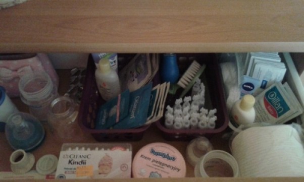 Ostatnie poprawki i instrukcje dla męza co gdzie schowane:) Sprawdzenie stanu wszystkiego co tylko potrzebne. Sól, waciki, kremy, mydełka, ubranka, aspiratorek, patyczki -są!