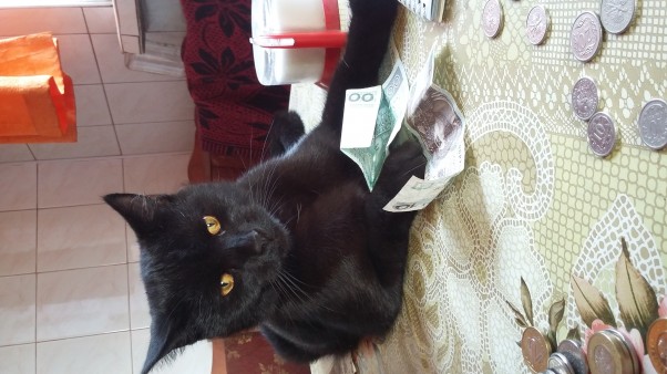 Przygotowania do powitania dzieciątka wiążą się z dobrym rozplanowaniem wydatków i tu przyda się fachowa pomoc osobistego księgowego :) Moim pomocnikiem w odkładaniu pieniążków na przywitanie dzidziusia jest kocurek Magnat. Skrupulatnie odkłada banknoty, bo wie, że dziecko będzie miało duże potrzeby, a dla mamusi pozostają drobniaki :)