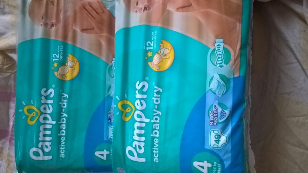 słyszałam o pewnej promocji pieluszek pampers więc powiedziałam mojemu mężowi by pojechał do sklepu i kupił dwa opakowania tych pieluszek-zapomniałam powiedzieć że na sam początek potrzebujemy rozmiaru 2 a nie 4 :D :D :D  także zapas pieluszek zaczynamy od większego rozmiaru :D