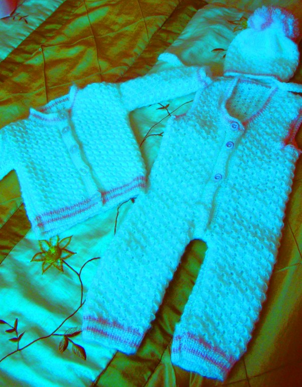 Dorianku Twoja babcia Halinka oprócz wielkiego serca ma również ogromny talent, piękne rzeczy robi na drutach i tak dzisiaj obdarowała Cię pięknym własnoręcznie zrobionym kompletem. Kiedy byłam małą dziewczynką często Twoja babcia robiła mi na drutach piękne kolorowe sweterki, czapeczki z takimi dużymi pomponikami  a nawet spodnie ala getry dużo było śmiechu kiedy je miałam na sobie bo każdy się mnie pytał dlaczego chodzę w rajtuzach :) oni się nie znali na modzie :) Troszku Dorianku taki sentymentalny dzień dzisiaj mamy, z babcią powspominałyśmy moje dzieciństwo i dowiedziałam się że Twój dziadziuś a mój tatuś gdy byłam nie grzeczna straszył mnie że jestem zrobiona na drutach i mnie spruje :) jako dziecko wierzyłam w to i się zaraz uspokajałam :)