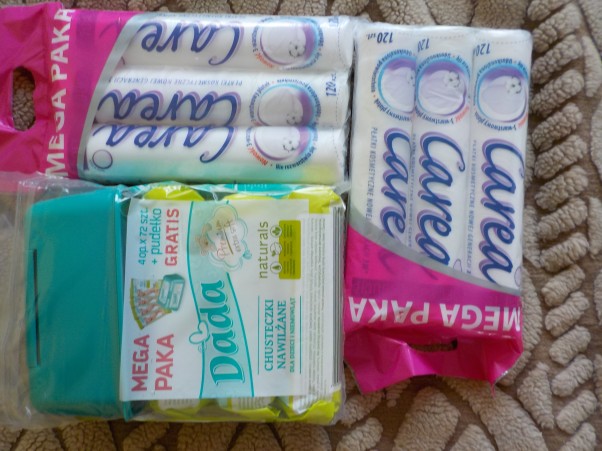 Zaczęliśmy kupowanie od chusteczek "do pupy" z przydanym pojemnikiem zapobiegającym wysychaniu, a jednocześnie ułatwiający pielęgnację bobasa oraz od płatków kosmetycznych, których przyda się duuużżżżooo. Zapas mam nadzieję na miesiąc albo dwa.