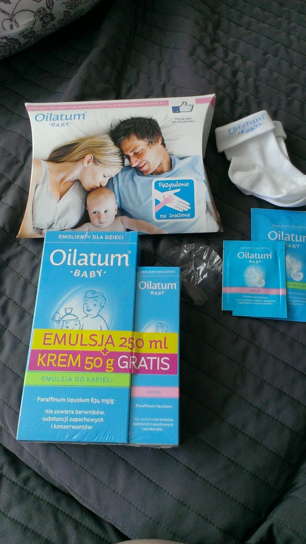 Ostatnio, rozmawiajac z doswiadczona kolezanka- mama ;) o kapieli i pielegnacji dzidziusia, polecila mi produkty Oilatum Baby... bo dobre, bo nie uczulaja, bo polskie, bo w przystepnej cenie jak na jakosc...wiec sie skusilam (na emulsje do kapieli i krem do ciala) i kupilam do wyprawki... i nawet znalazlam zestaw w super cenie za 40zl i dodatkowo otrzymalam probki i skarpeteczki w aptece :) <3