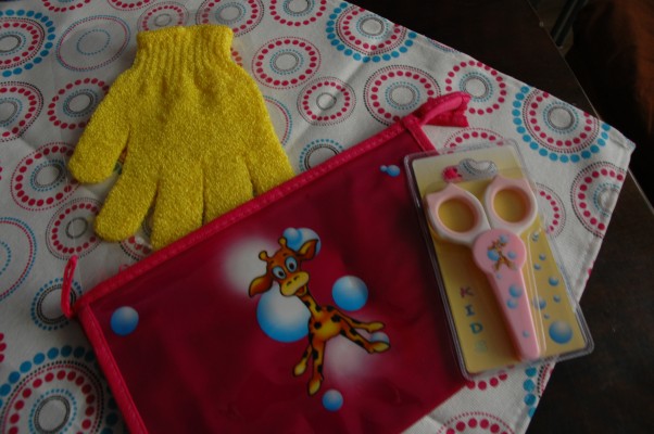 Oj ale ze mnie chomik ;-) przy przeprowadzce do naszego nowego domku w jednej z szafek znaleźliśmy kosmetyczkę, rękawiczki do mycia maleństwa i nożyczki z zaokrąglonymi noskami. Nie jestem pewna czy nam się one przydadzą ale może? Kosmetyczka dla Hani będzie idealna tzn właściwie na kosmetyki do jej pielęgnacji, rękawiczki? nie jestem przekonana ale może jak będzie trochę większa to je wykorzystamy? Najbardziej zastanawiają mnie te nożyczki... A wszystko to upchane było w szafce bo dostałam to kiedyś dawno temu podczas praktyk studenckich jak bonus ;-) Wtedy nawet nie myśleliśmy o dziecku, a teraz proszę - miłe odkrycie. Pakowanie prawie jak poszukiwanie skarbów ;-)