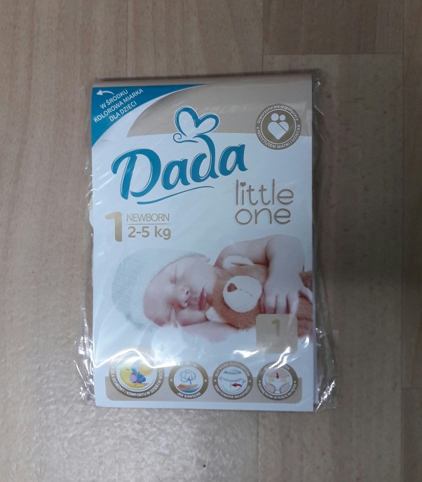 Próbna pieluszka jednorazowa DADA dla noworodka. Myślę o tym żeby kupić pieluchy firmy Pampers ale zobaczymy jak ta się spisze