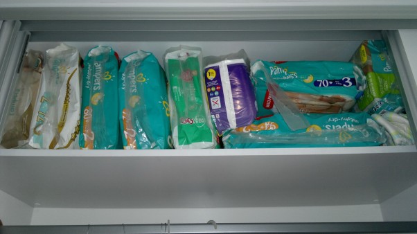 I dotarli zapowiedziani goście. Siostra przyniosła nam sporo pieluszek, które zostały jej niewykorzystane ( opakowanie dwójek, kilka paczek trójek i na następnym zdjęciu większe) Mąż spakował wszystko do szafy zanim zrobiłam zdjęcie :)