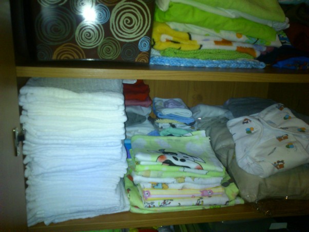 Nadszedł już czas na przygotowanie pieluch. Zamierzamy używać zamiennie tetrowych i jednorazowych. Zakupiliśmy na początek 30 białych, do tego majteczki otulaczki i jest komplet. Kilka kolorowych do twarzy w razie ulewania czy ślinotoku też przygotowane. Wyprane i świeżo wyprasowane przez teściową, która postanowiła dołożyć swoją cegiełkę do przygotowań :-)