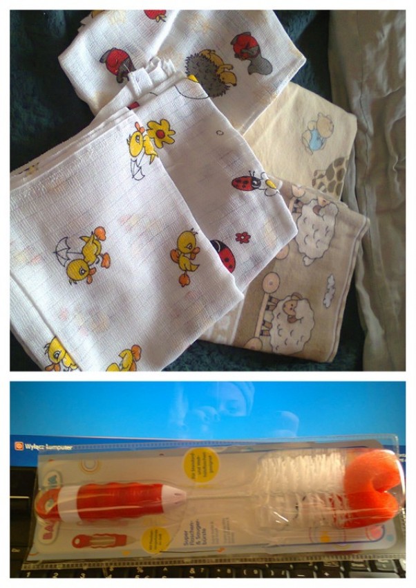 W drodze powrotnej wstąpiliśmy do sklepu po parę artykułów spożywczych żebym nie musiałam latać po sklepach sama i jak zawsze kupiliśmy coś dla Naszego Kochanego Synka :) po dwie śliczne, kolorowe pieluszki tetrowe i flanelowe oraz szczotkę do czyszczenia butelek, które były jednym z pierwszych kupionych przez Nas rzeczy z listy wyprawkowej :)