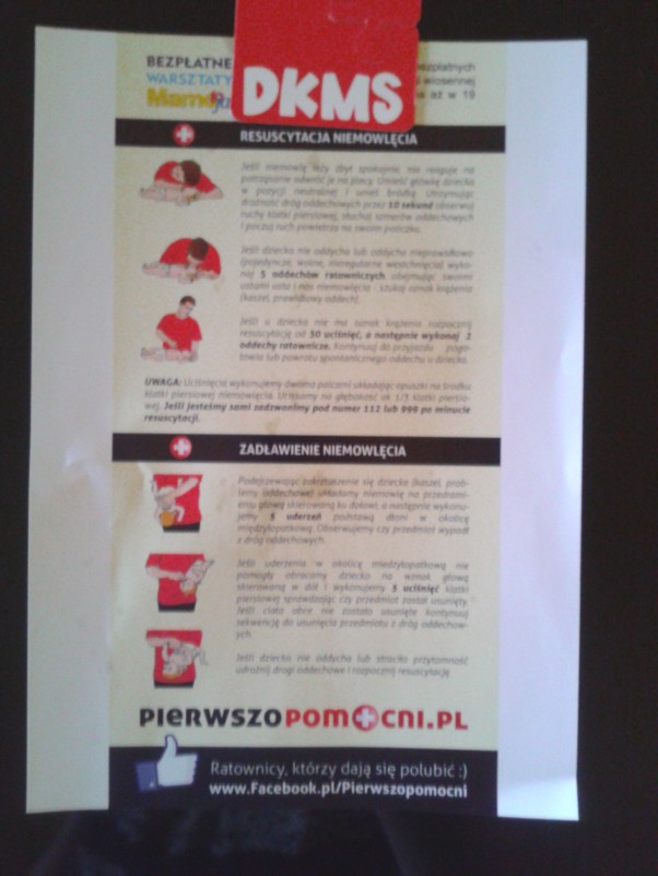Na warsztatach, na których ostatnio byłam dużo miejsca zajmowała tematyka udzielania pierwszej pomocy niemowlęciu. Warto było zobaczyć jak to wszystko wygląda w praktyce (oczywiście na lalkach). Chciałam też, abyśmy utrwalali te zagadnienia każdego dnia, dlatego ulotka zawisła na naszej lodówce. W końcu każdy co dzień do niej zagląda :)