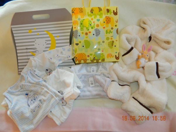 Maluszka wprawdzie jeszcze z nami nie ma ale dostaliśmy już pierwsze prezenty - w wersji kolorystycznej uniwersalnej oczywiście :) Śpioszki, body, pajacyki i zajączek - a wszystko przyjechało aż z Niemiec. Bardzo dziękujemy ciociom za pamięć :)