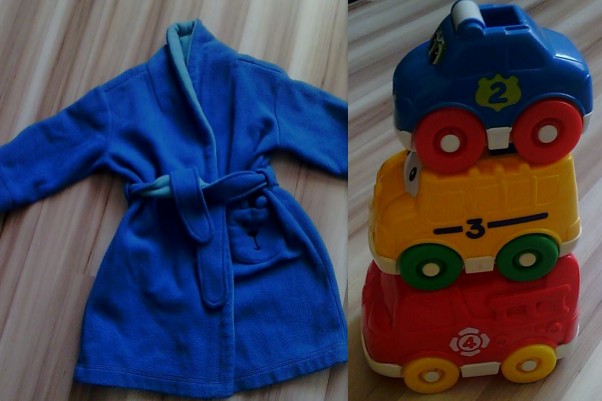 Nagle zadzwonił dzwonek do drzwi, otwieram, i co widzę? Stoi ona a w ręku trzyma zabawki i kawałek granatowego materiału.