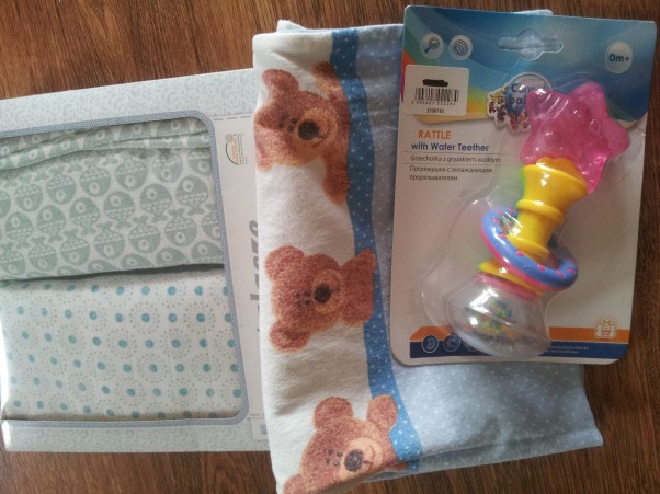 Dziś byłam w sklepie pooglądać akcesoria niemowlęce Nie mogłam sie oprzeć i zakupiłam pierwsze gadżety: grzechotkę, otulacze, pieluchę tetrową. Daje to dużo radości!