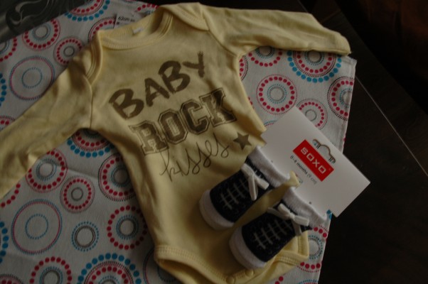 Do tej pory mój mąż twierdził, że jeszcze mamy mnóstwo czasu na kompletowanie wyprawki. Twierdził, że jeszcze nie przywieźliśmy od rodziców komody w której moglibyśmy układać rzeczy Hani, a wszystko zdążymy zrobić w styczniu... Nastąpiła jednak zmiana ;-) pierwsze zakupy męża dla naszego dziecka. Ponieważ postanowiliśmy, że Małą będziemy ubierać w ubranka we wszystkich kolorach ( nawet niebieskie) głownie natomiast w neutralne jak zieleń, żółty i czerwony to tatuś zakupił dla swojej księżniczki taki o to zestaw. Na szczęście jeszcze nie produkują skarpeteczek czy bucików podobnych do glanów. Ale kto wie? Może już niedługo mężu i takie znajdzie dla Małej?