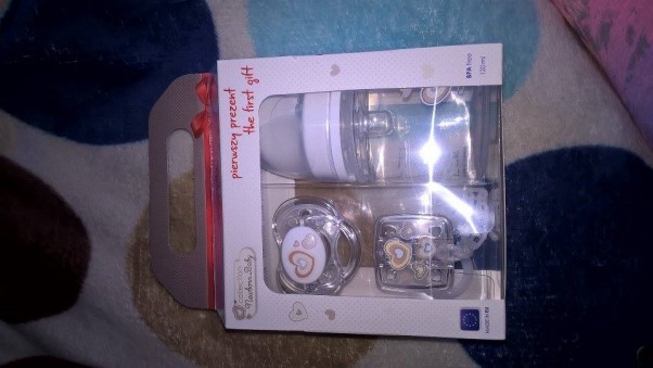 Choc nie pierwszy ale tak ms napisane na pudełku. Butelka smoczek i zawieszka z jednym i takim samym motywem w serduszka-taki komplet butelkowo smoczkowy;) dziękujemy babci