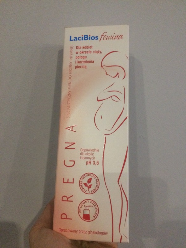 Położna polecała taki z korą dębu, więc znalazłam w intenetowej aptece płyn do higieny intymnej dla kobiet w ciąży i w połogu marki Lacibios Femina Pregna