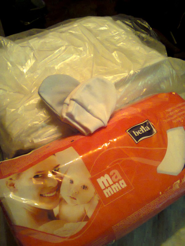 Oczywiście nie odbyło się od małych podarków ;) kuzynka jak zawsze dała rzeczy które będę potrzebować w szpitalu. I tak otrzymałam znowu podkłady i podpaski poporodowe :D