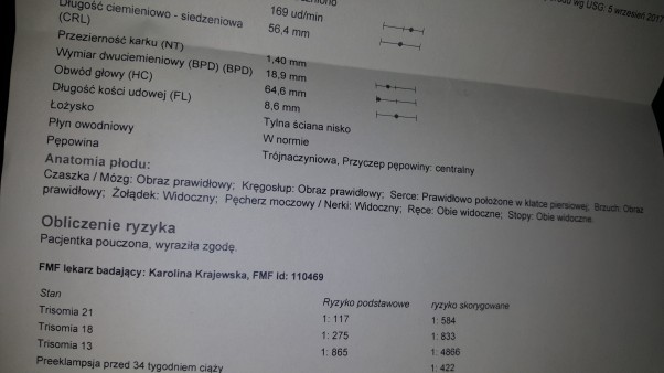 Wg usg wszystko jest dobrze nie mamy zagrożenia chorobami genetycznym. Poza tym wszystkie narządy są na swoim miejscu i prawidłowo się rozwijają....