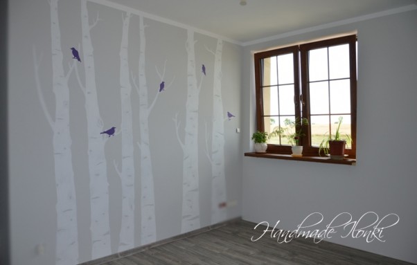 Na poprawę humoru po wizycie w hurtowni wymyśliłam sobie, że pomaluje u siostry w pokoju na ścianie brzozy z siedzącymi ptakami. Do końca weekendu mieliśmy być u rodziców w domku, który wykańczają...tak tez uczyniłam...