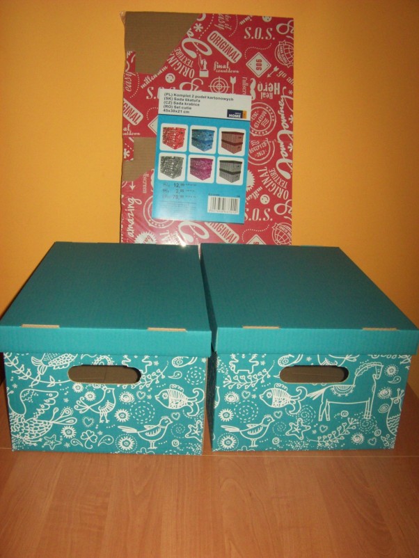 Mąż wpada na pomysł zakupienia opakowań na posegregowane rzeczy. Szczęśliwie w Pepco trafiamy na promocję. 2 duże kartony w cenie 13 zł.