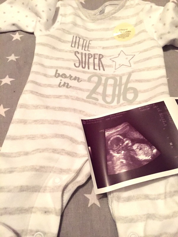 Dzisiejszy dzień był przełomowy: lekarz rozwiał wszelkie wątpliwości co do istnienia tych przerażających taśm owodniowych mówiąc, że to jedynie niegroźna płaszczyzna owodniowa. Zdradził również, że 156 gram szczęścia zamieszkującego mój brzuch to chłopiec. Ku uciesze mojego męża :) Mogliśmy więc kupić pierwsze ubranko dla Maluszka :)